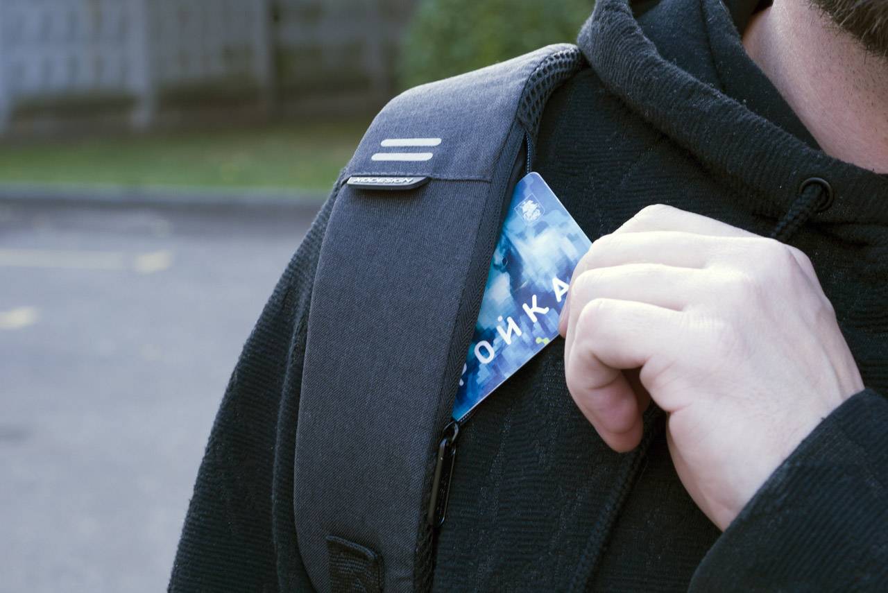 Например, на лямке есть кармашек на молнии для транспортной карты с RFID-защитой. Удобно доставать карточку в метро, не снимая рюкзак.