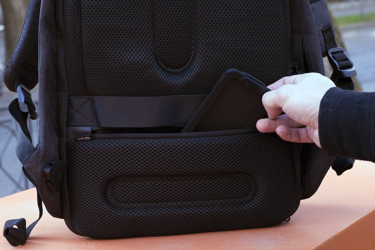 Третий карман для мелочёвки, или компактной читалки, можно найти чуть выше в спинке. Он без RFID-защиты, но также надёжно защищён от жадных рук воришек, плотно прилегая к спине во время носки Bobby Pro.
