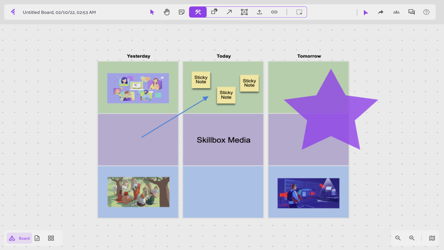 Основная доска имеет множество шаблонов, которые вы можете вставить, например, канбан-доски, блок-схемы, интеллектуальные карты и т.д. Это фантастическая система для использования различных методов мозгового штурма на цифровой доске.