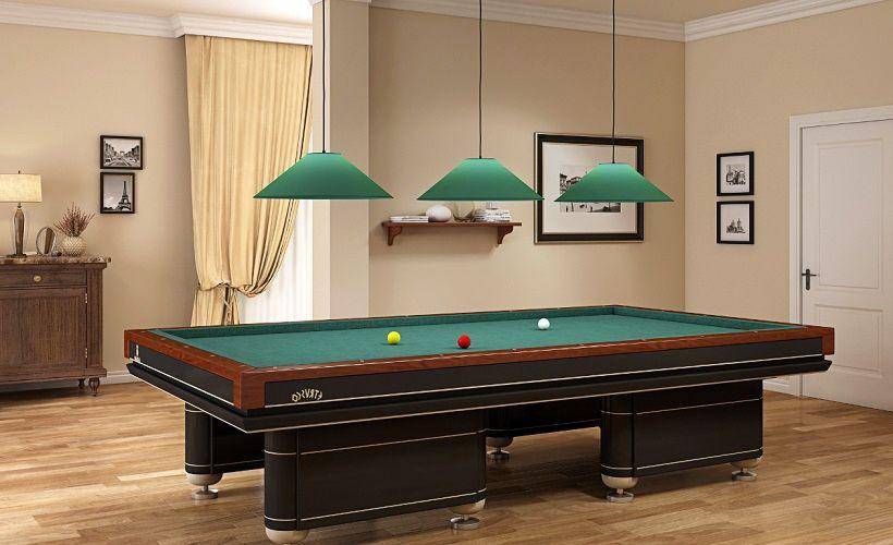 Начнем с размера бильярдного стола. Как Вы знаете, есть русский и американский бильярд. Так вот размер зависит от того, какой именно бильярд Вы предпочитаете. Так для русского подходят столы размером от 8 до 12 футов, а для американского пула предназначены столы от 7 до 9 футов. Кроме этого, размером бильярдного стола все не заканчивается. От него зависит размер в комнате в целом, чтобы при игре Вам ничего не мешало.