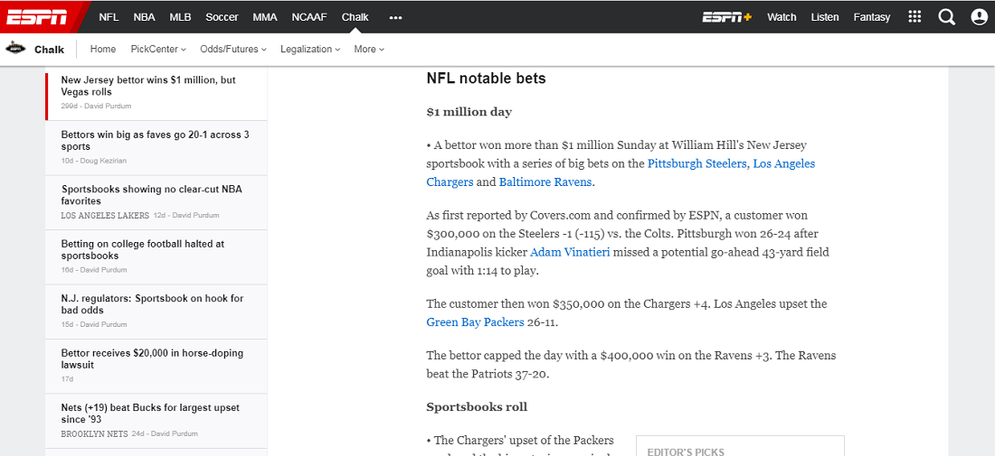 Также на зарубежных сайтах регулярно появляются новости о крупных выигрышах в букмекерских конторах США у тех, кто ставит на НФЛ. Ниже приводится одна из них. Там пишут, что в Нью-Джерси игрок заработал 1 млн долларов на ставках. Он заключил серию пари на 3 команды. Дальше пишут о трех бетторах, которые смогли поднять 300 тысяч, 350 тысяч и 400 тысяч долларов при помощи подобных пари.
