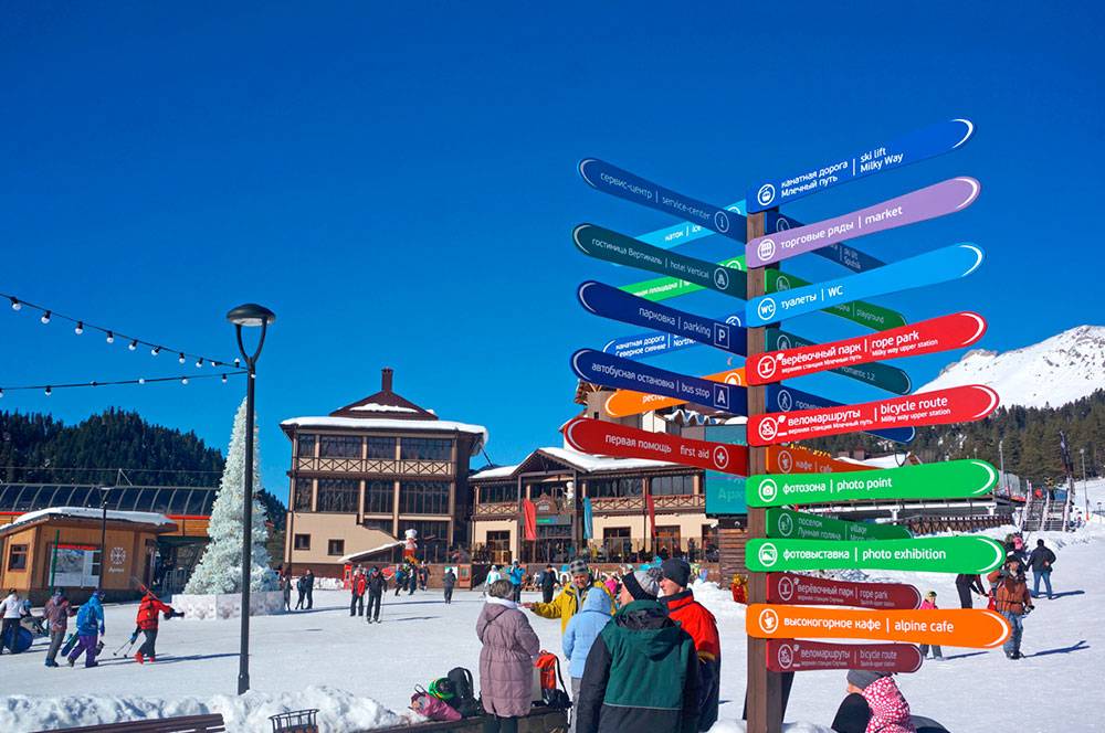 На территории поселка расположен сервисный центр, предлагающий все необходимое для комфортного отдыха и оборудованный бесплатным Wi-Fi. Здесь есть стойка информации, можно приобрести билеты и взять на прокат снаряжение или получить медицинскую помощь. Также можно вкусно поесть – предлагается столовая, ресторан «Трамплин» и несколько кафе. Везде возможна оплата безналичным расчетом.