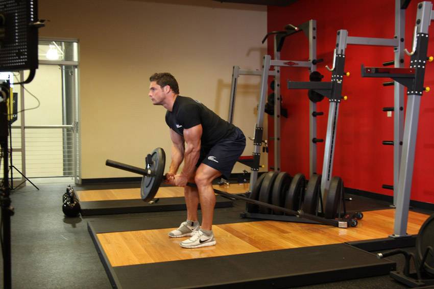 Встаньте прямо, стопы на ширине плеч. Возьмите штангу прямым хватом. Уведите таз назад, слегка согните колени, наклонитесь корпусом вперед. Руки со штангой опустите вниз. Согните локти, сведите лопатки, подтяните штангу к корпусу. Затем плавно опустите снаряд вниз. Это составит один повтор. Выполните упражнение в 3-4 подхода по 10-12 повторов в каждом.