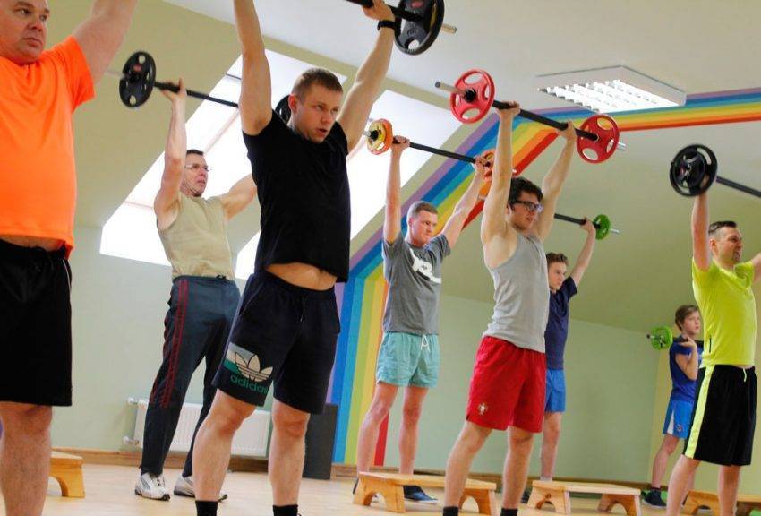 - Ноги ставятся на уровне шире плеч. Груз и руки поднимаются над головой, после чего осуществляются наклоны, то в одну, то в другую сторону. Руки при этом не сгибаются. Число таких движений – до 12 раз в одну и другую сторону.