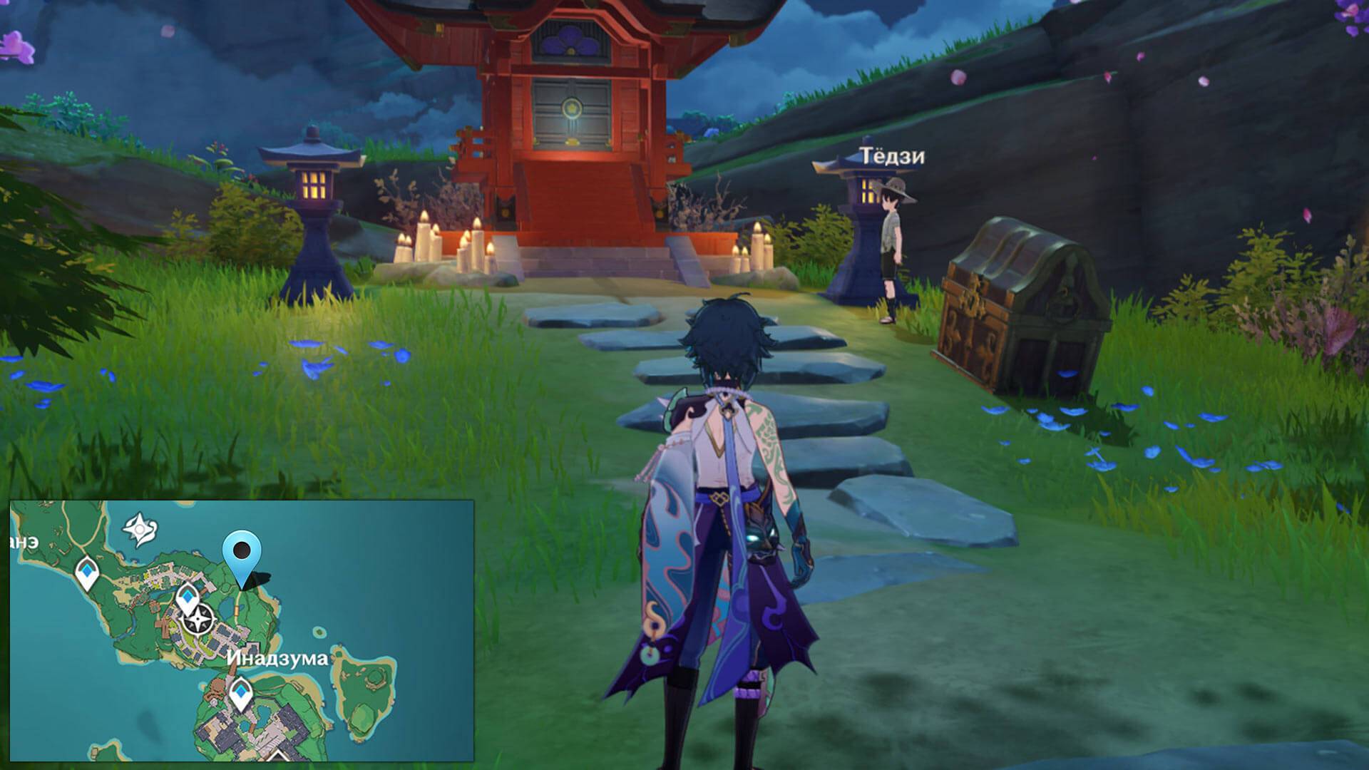 Перемещаемся в город Инадзума и бежим вверх по карте по тропинке. Тедзи стоит у алтаря, а рядом появится Драгоценный сундук.