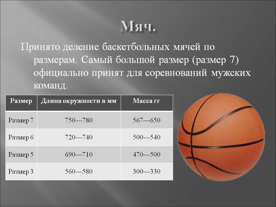 Стандартным для игры в баскетбол считается мяч с окружностью от 749 до 780 мм и весом от 567 до 650 г. Такому изделию присваивается размер 7. Им играют взрослые мужчины. Женщины и подростки до 16 лет пользуются изделием под номером 6, окружность которого составляет 724–737 мм, а вес — 510–567 грамм.