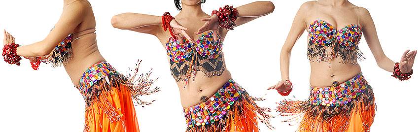Bellydance для начинающих лучше танцевать в коротком топе, оголяющем живот, и лосинах (бриджах). Позднее наряд дополняют набедренной повязкой со звенящими монетками.
