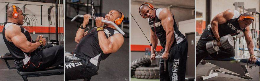 - Поднятие штанги из положения стоя либо поднятие гантелей на скамье+ подтягивания на турнике либо тяга блока на тренажере.