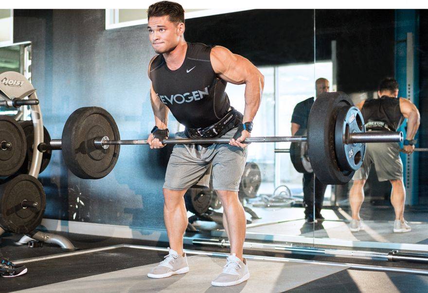 - Простые отжимания от пола или жим грифа в положении лежа + тяга штанги к поясу из положения стоя или с использованием тренажера.