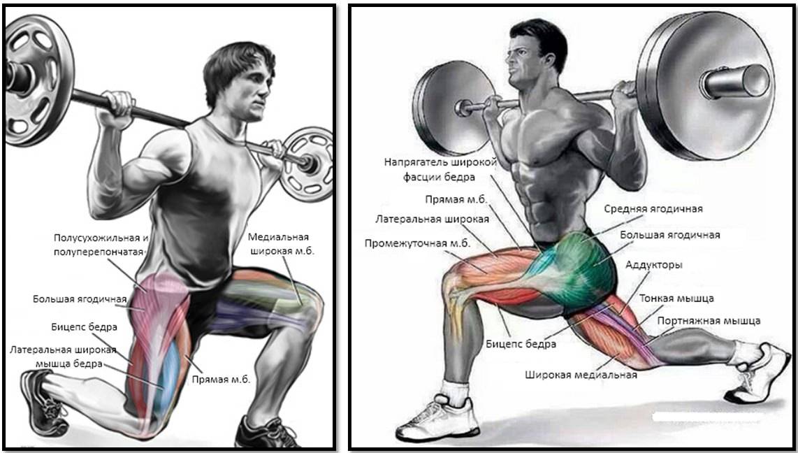 Такое, казалось бы, простое упражнение многие люди делают неправильно. При выполнении выпадов без дополнительной нагрузки, риск повреждения суставов сводится к минимуму (необходимо сделать по 100-150 подходов за раз, чтобы почувствовать неприятные симптомы). Но добавление штанги значительно увеличит нагрузку на коленные суставы. Если колено будет располагаться строго над стопой, весь вес возьмут на себя ягодичные мышцы. В противном случае вся нагрузка переносится на колено.