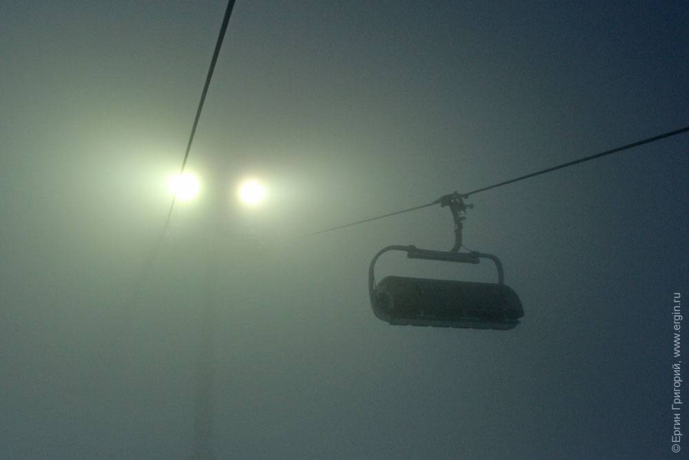 Катание по красным и черным трассам в молоке было однозначно не в кайф. А по финальной черной трассе кататься было не очень комфортно, даже когда мглу немного раздуло. Подъемники старые, на большом уклоне просто сидишь на швабре, подъем все время виляет — уклон влево вправо тоже есть. В общем, съехав несколько раз, я сдал скипас и поехал в Снежную деревню на скибасе. SkiBus — автобус, ходящий в конкретное время по расписанию и обходящий все основные объекты, интересные горнолыжникам. Он имеет свой знак остановки: