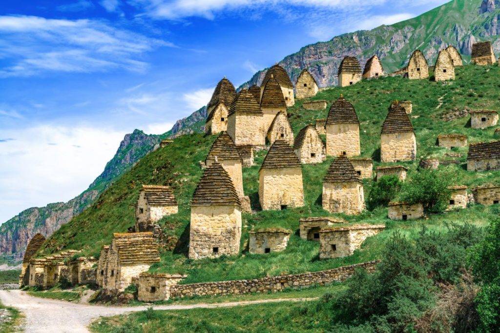Город мёртвых, старинный некрополь — это самая популярная достопримечательность республики. На склоне холма на фоне высоких гор рассыпаны домики-склепы. Внутри, сквозь маленькие окошки, видны черепа, кости, гробы в форме лодок. Зрелище одновременно живописное, внушительное и заставляющее задуматься. Даргавс расположен в 43 км от Владикавказа, на машине это расстояние вы преодолеете примерно за час, проезжая через живописное Кармадонское ущелье.