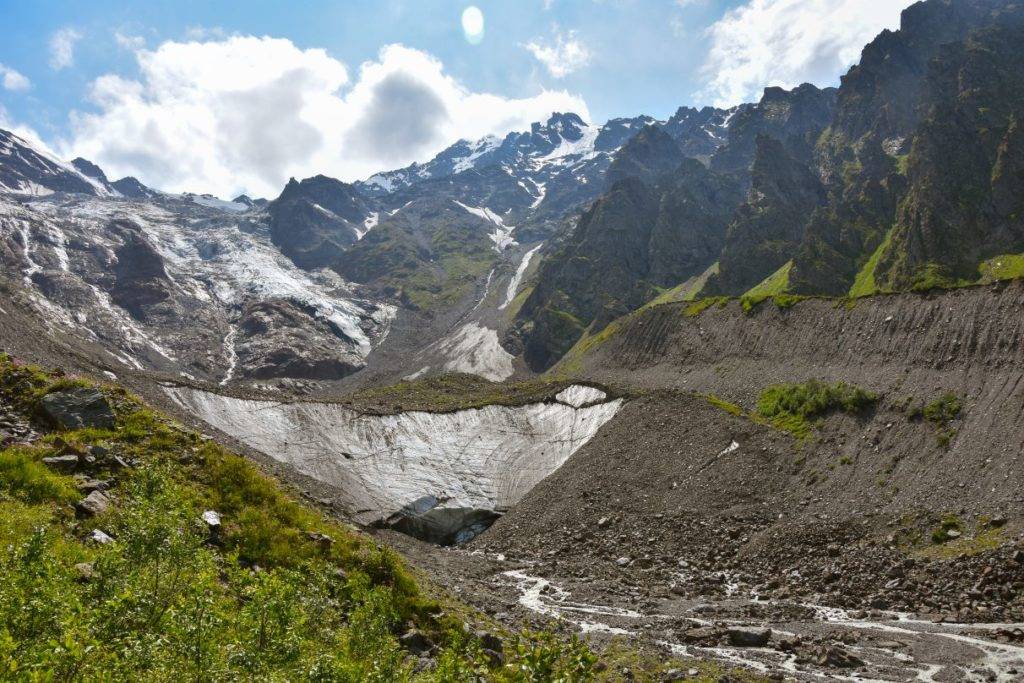 Тропа по краю ущелья идёт через живописные мостики, заросли рододендронов и выводит на язык ледника. С основной видовой точки (42.837078, 43.707899) рассмотрите, как ледяной гигант сползает с гор в долину.