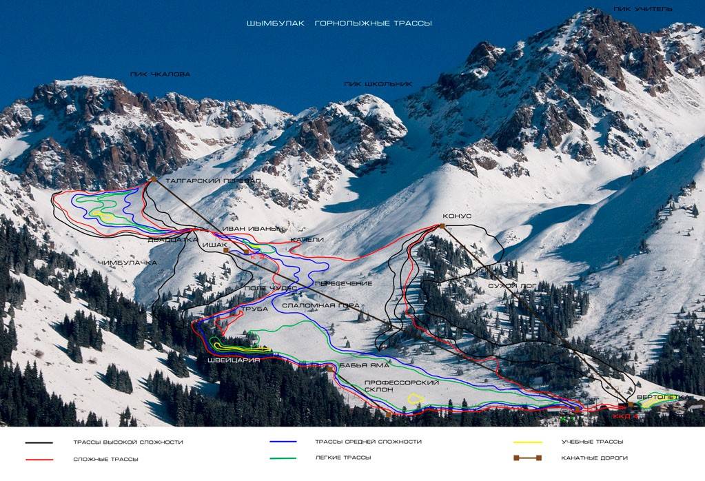 Горнолыжный курорт Чимбулак — это довольно большой по протяженности комплекс, включающий в себя 8 сертифицированных и несколько «неофициальных» трасс различной сложности: от легких «зеленых» маршрутов до «черных» трасс повышенной сложности. Перепад высот на Чимбулаке значителен — до 900 метров. Есть слаломный и скоростной спуск длиной в 1,5 и 3,5 километров соответственно.