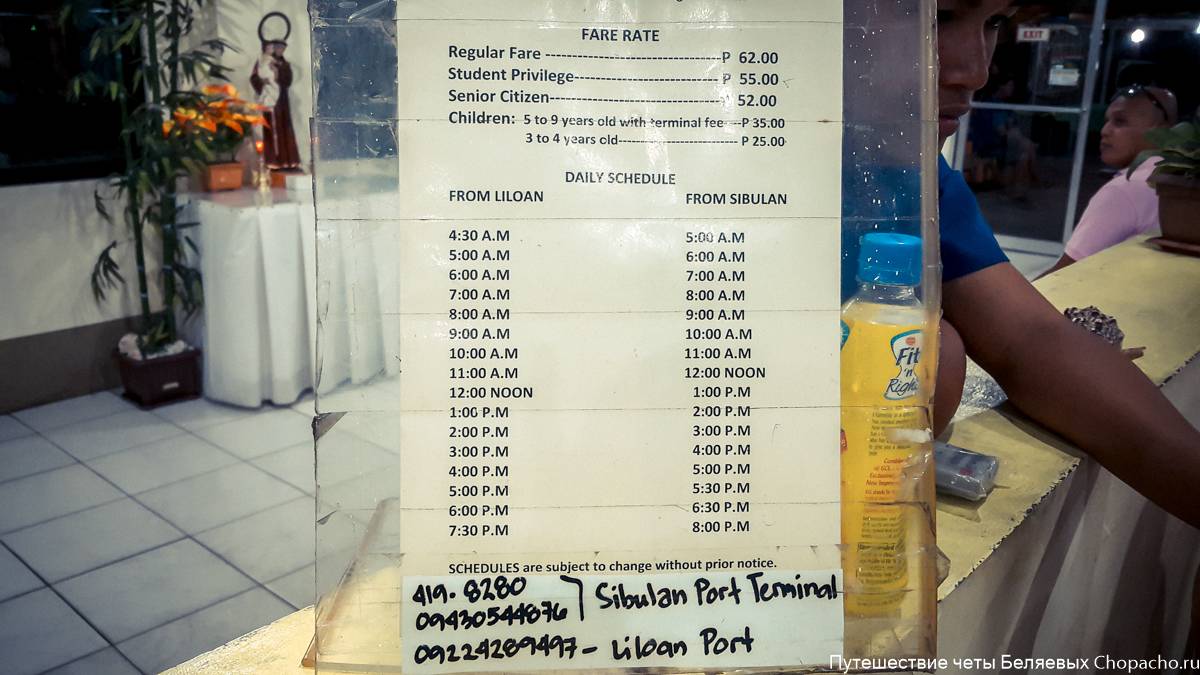 - В Думагете несколько портов. Вам нужен порт Sibulan (см. карту). С него ходят паромы и катера до ближайшего к Ослобу порта Liluan (см. карту). Расписание паромов и катеров из Думагете до Себу (Sibulan — Liluan) и обратно: