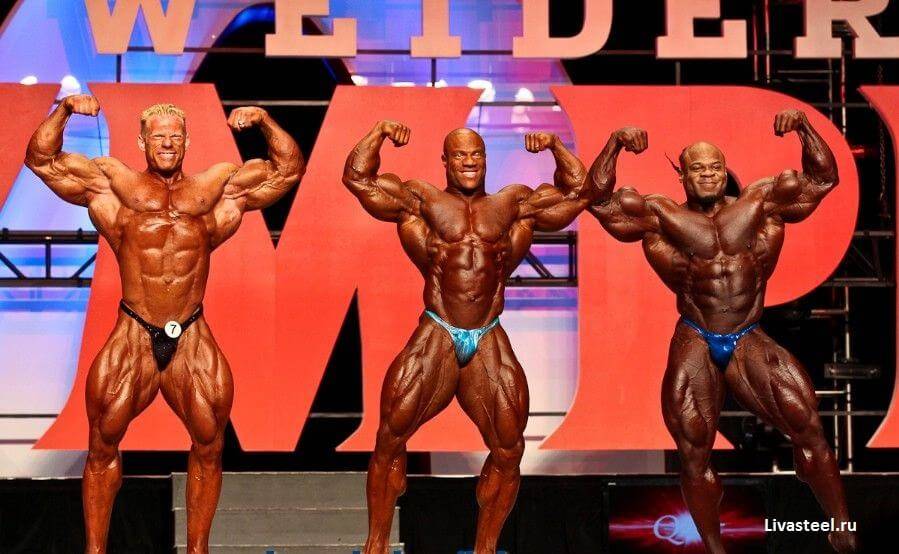 Мистер Олимпия 2013 года. Слева на право: Деннис Вольф (3 место); Фил Хит (1 место); Кай Грин (2 место)