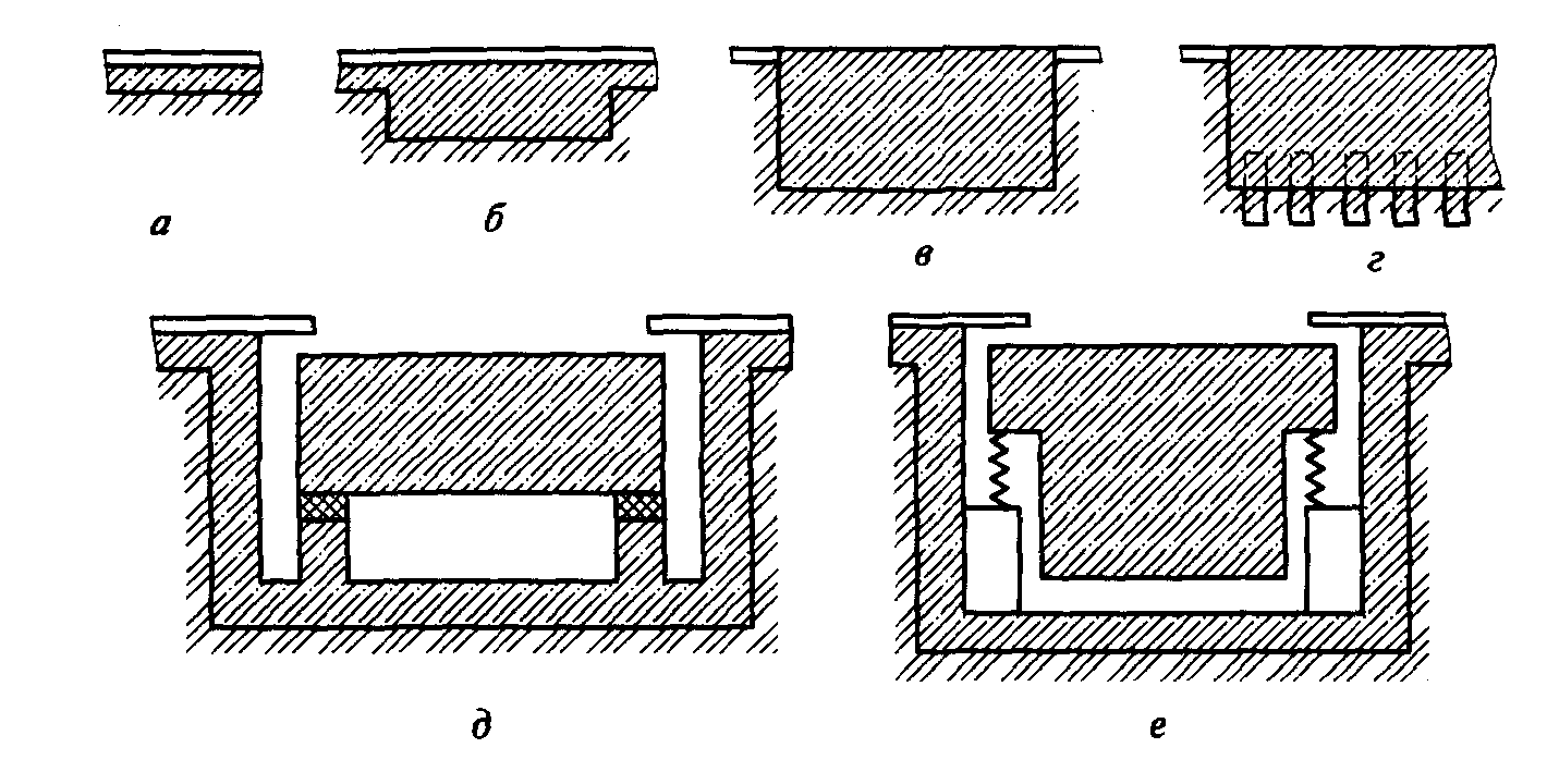 а — общая плита цеха; б — ленточный; в — обычного типа; г — свайный; д — на резиновых ковриках; е — на пружинах