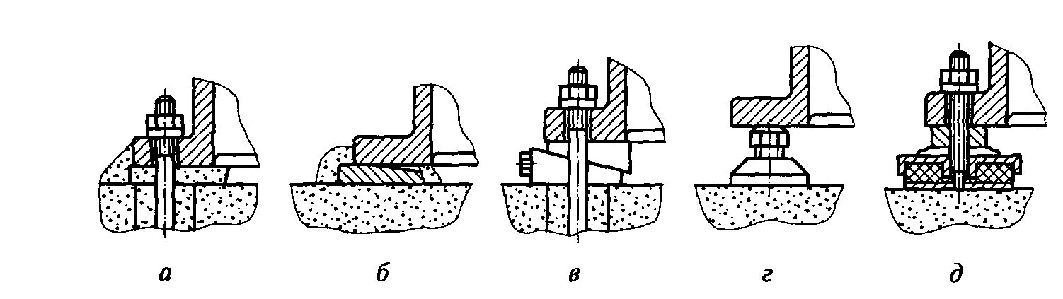 а — с подливкой опорной поверхности станины цементным раствором и креплением фундаментными болтами; б — с подливкой без крепления болтами; в, г — на регулируемых жестких опорах; д — на упругих опораx