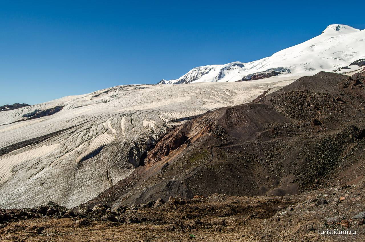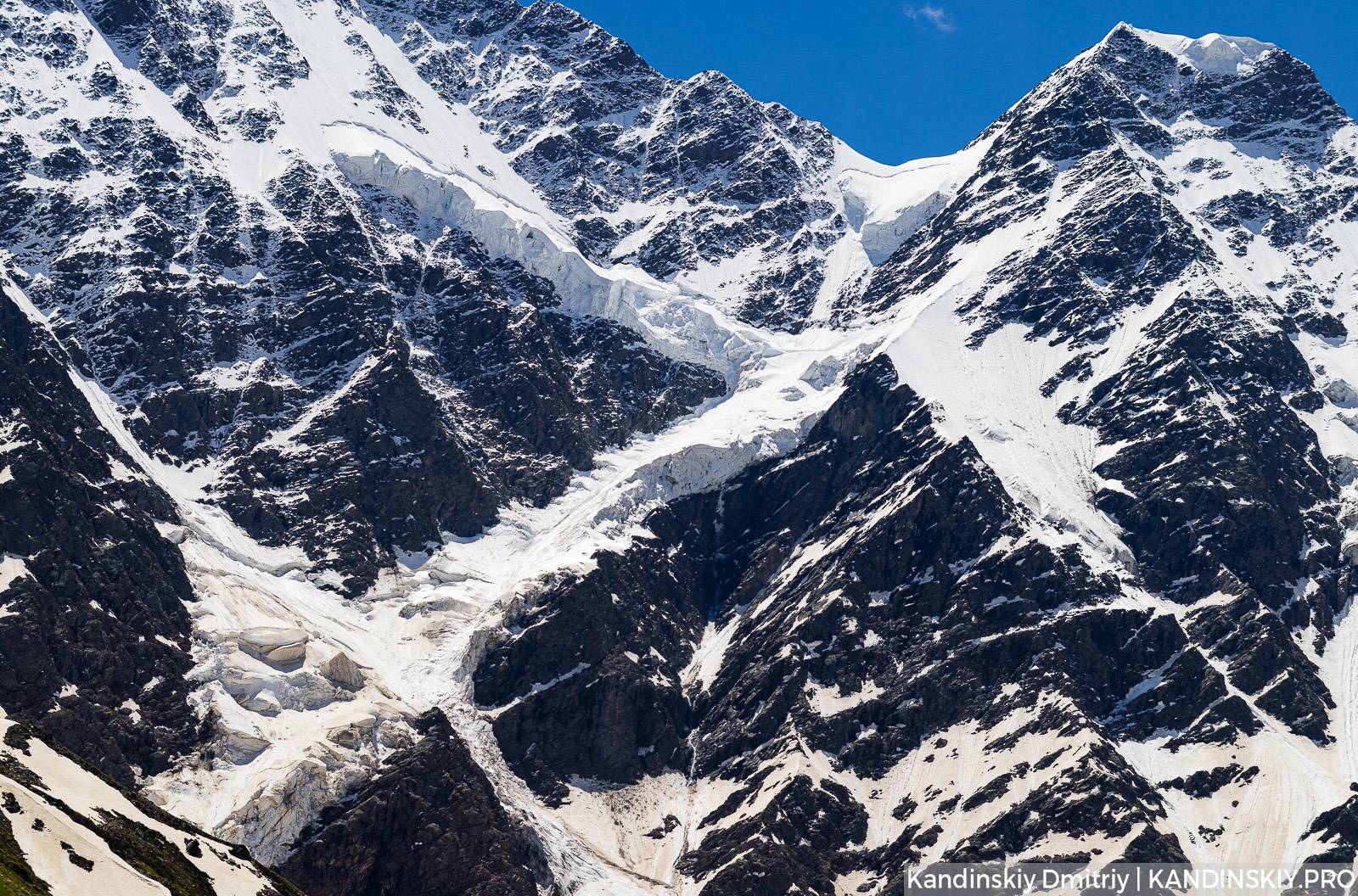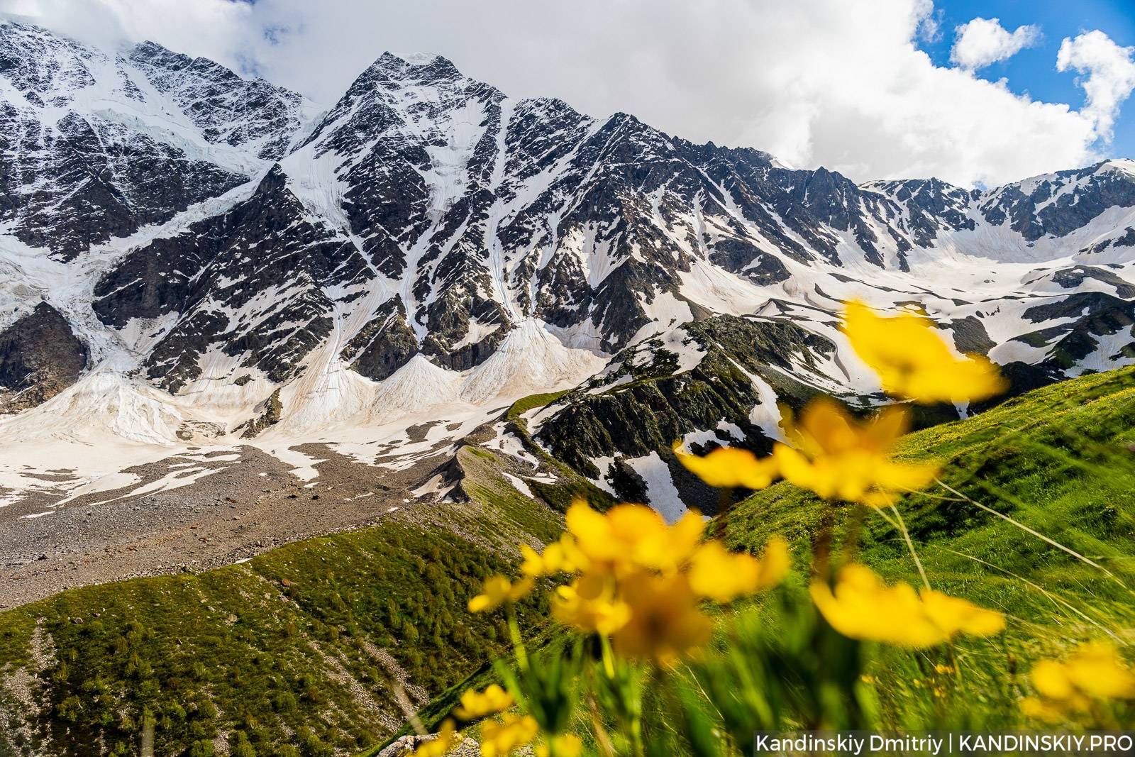 Подъем наверх тут непростой, он начинается с поляны Чегет: тропа сразу уходит круто вверх, а затем становится чуть более пологой. Однако большую часть маршрута дорога будет идти вверх. Зато какие виды! Слева весь путь вас будет сопровождать величественный ледник «Семерка» и гора Донгуз-Орун (4 454 метра).