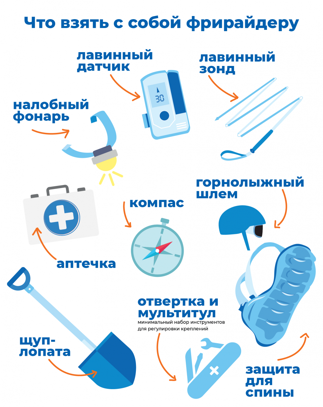 Необходимо понимать, что катание в горах вдали от цивилизации помимо адреналина и удовольствия еще и серьезный риск, не только здоровью, но и жизни. Основные опасности фрирайдера – это лавины и невозможность оказать быструю первую помощь в случае травмы. При вылазках в горы рекомендуется иметь при себе такое необходимое снаряжение, как лавинный датчик, рация, лавинная лопата. Не лишним будет иметь при себе средства для оказания первой медицинской помощи. Внимательно изучите правила техники безопасности в горах. Обязательно одевайте шлем, и специальную защиту под верхнюю одежду.