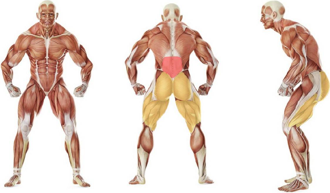 - Мышцы-выпрямители позвоночного столба (спины). Именно на них в любом варианте исполнения приходится основная нагрузка. .