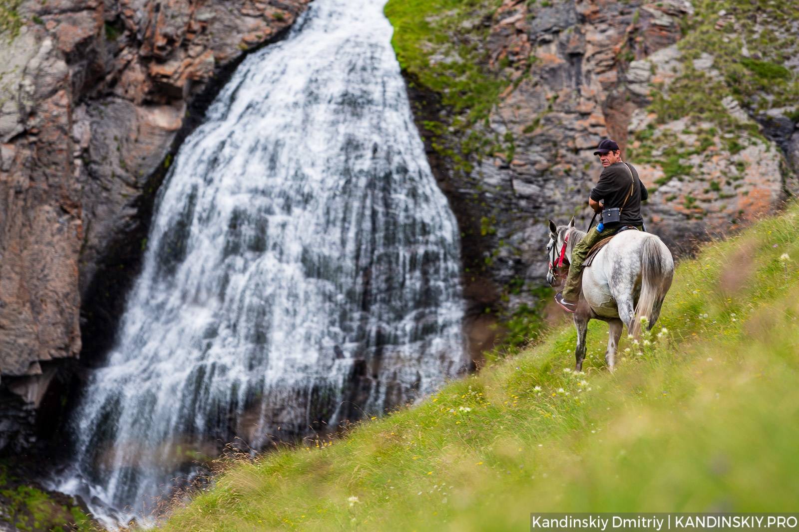 Пеший маршрут до водопада начинается в селе Терскол рядом с мечетью: если повернуться к ней левым боком, то начало пути будет по правую руку. Поднявшись немного вверх, вы наткнетесь на шлагбаум и пропускной пункт — здесь нужно внести плату за посещение маршрутов нацпарка.