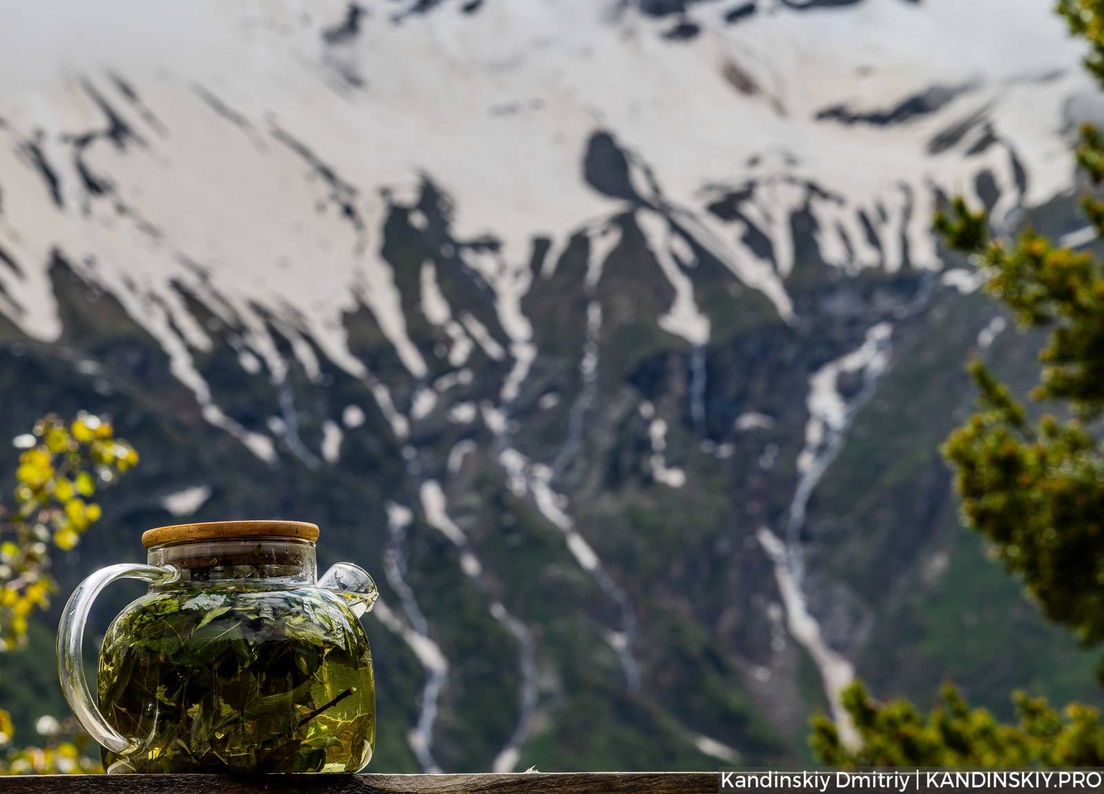 На полпути к водопаду есть кафе. В нем можно купить воду или чай, съесть хычин или штрудель. Идеально — остановиться в кафе на обратном пути, выпить травяной чай с видом на Главный Кавказский хребет.