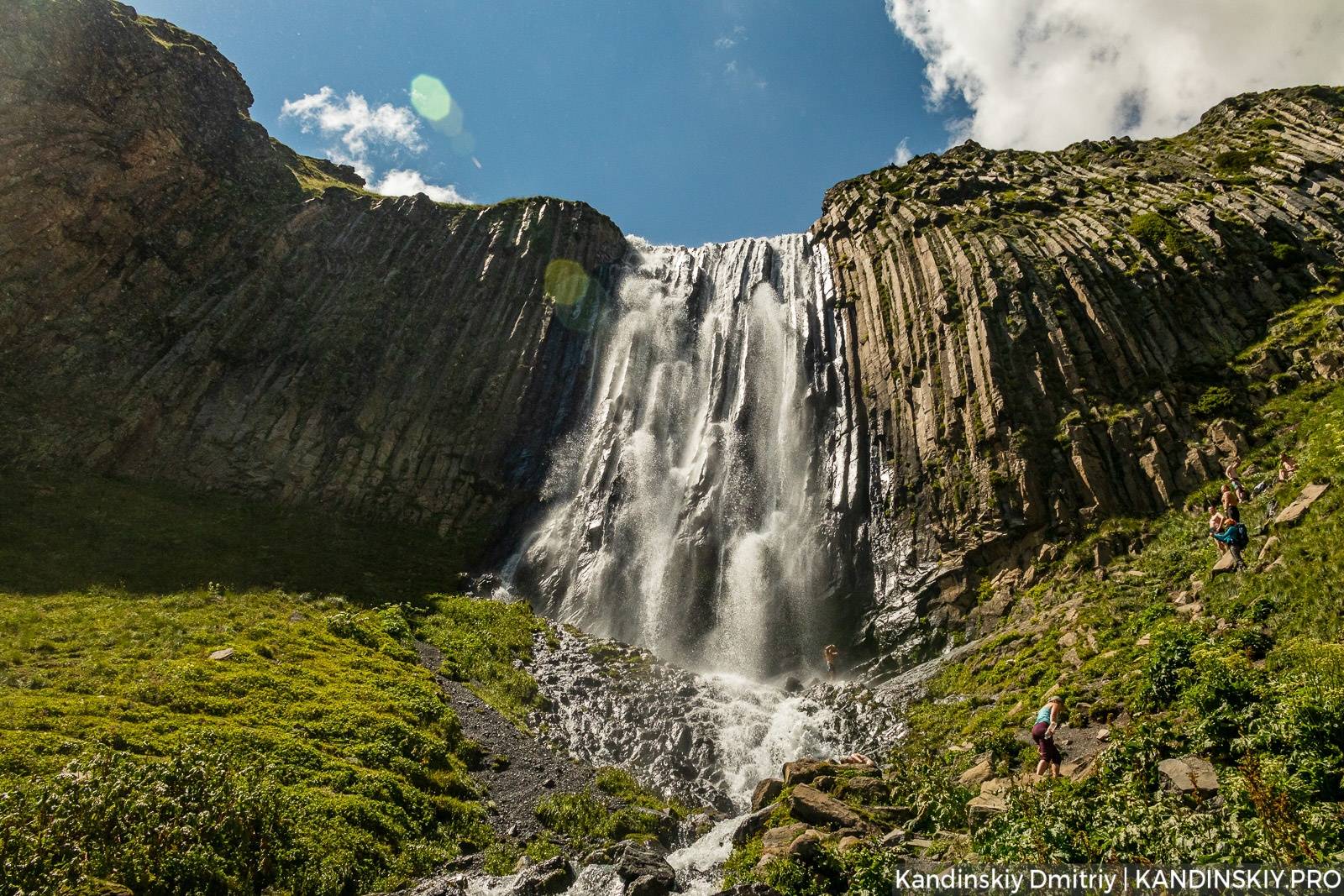 В конце маршрута вас будет ждать водопад Терскол. Вертикальная часть водопада имеет высоту 20 метров, а ширину — 12 метров.