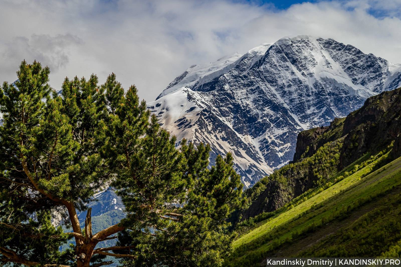 Лесная дорога выведет вас на высокогорные луга и скалы. Буквально с каждым шагом будут открываться потрясающие виды на соседний массив — Главный Кавказский хребет и склоны Чегета. С этой тропы вы сможете увидеть ледник «Семерка». Такое название он получил благодаря форме 7 с черточкой.