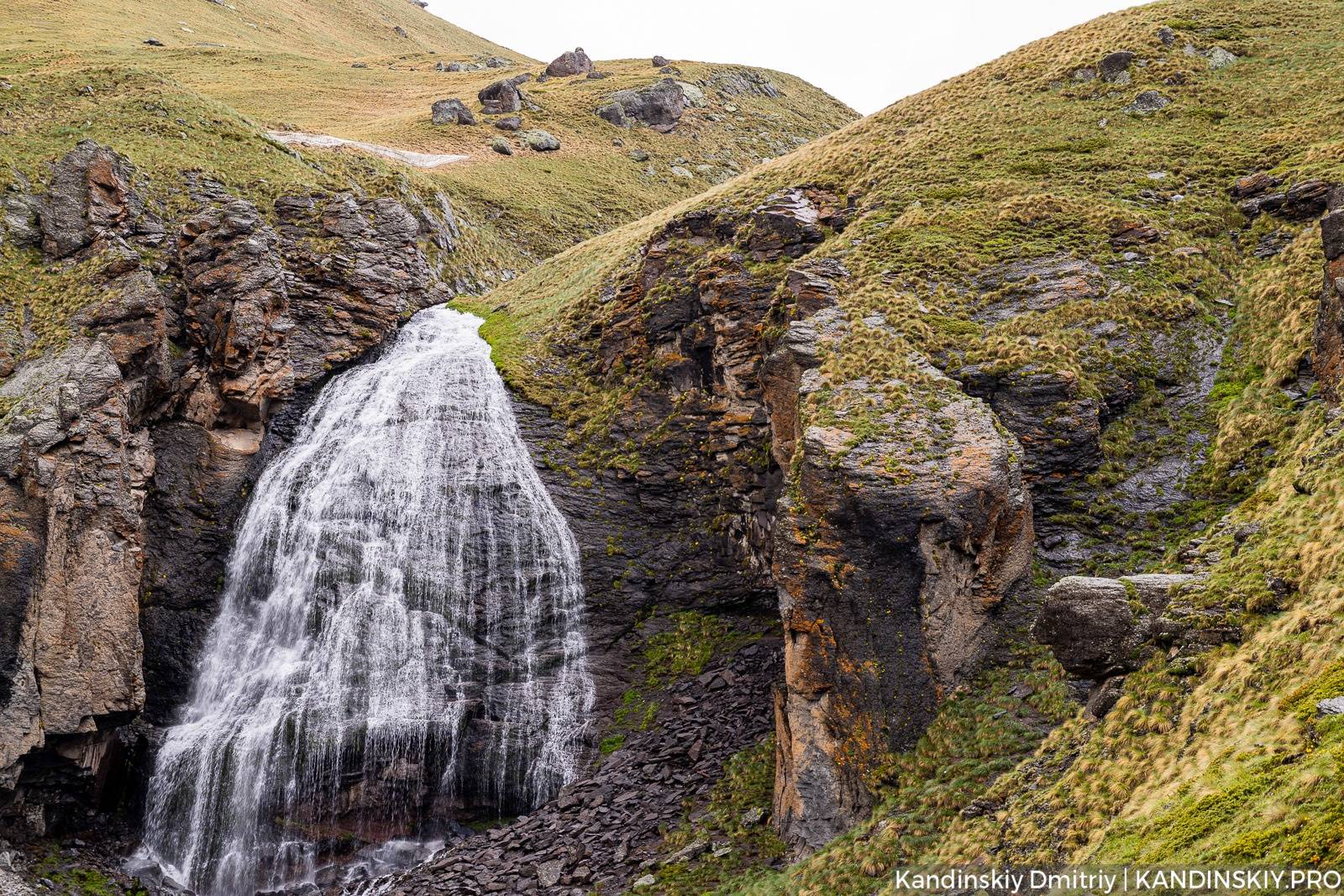 Путь к водопаду лежит по широкой тропе через южные склоны пика Терскол. Дорога все время будет идти вверх горным серпантином. Тропа пологая и проходимая, по ней даже могут проехать внедорожники. Они поднимают наверх туристов за определенную плату.