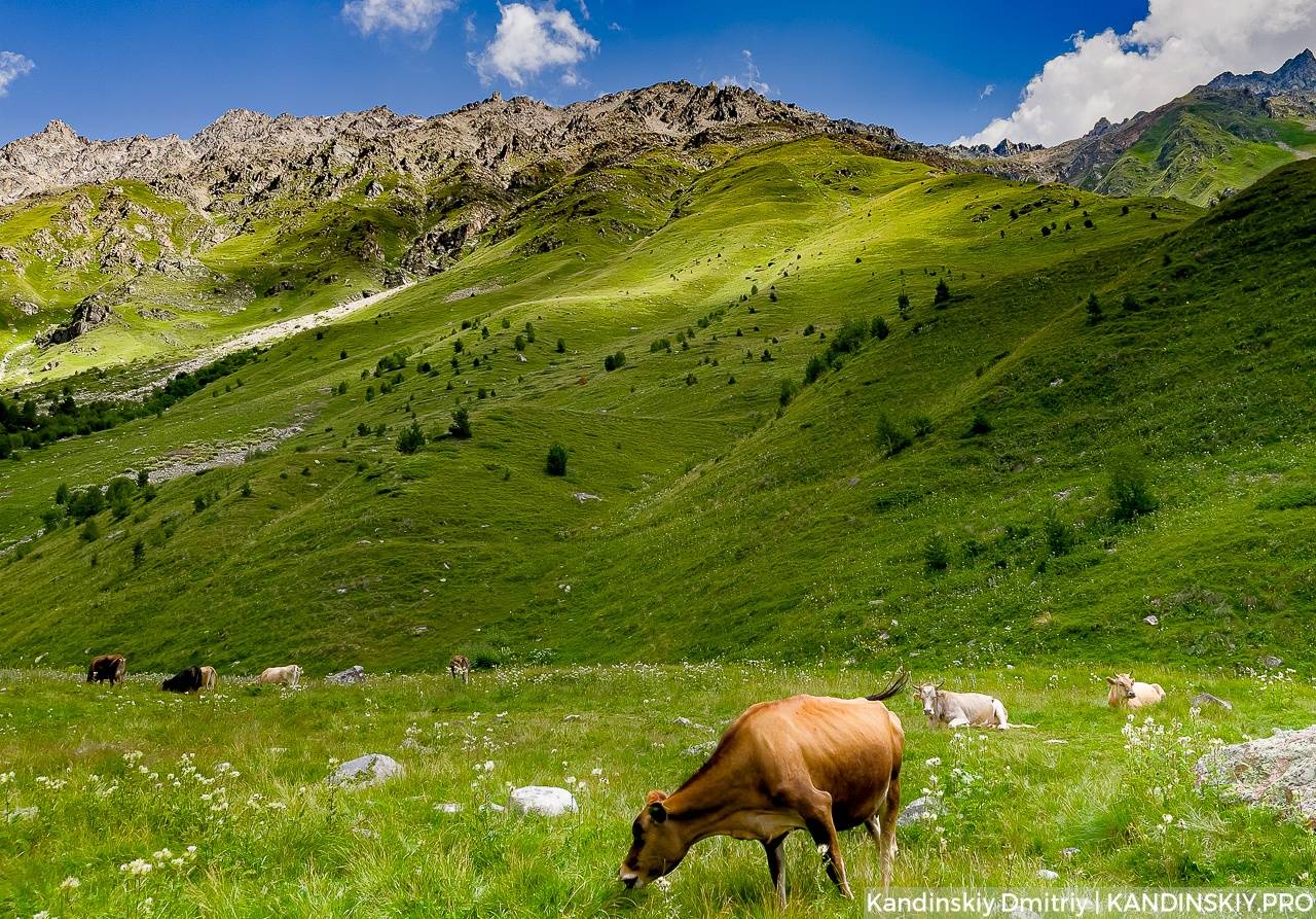 Прежде чем начнется маршрут, вам нужно будет преодолеть хозяйственные постройки, в которых живут коровы, быки, овцы и бараны. Коров вы будете часто здесь встречать, так как на склонах гор растет вкусная для них трава. После коровников уходим налево.