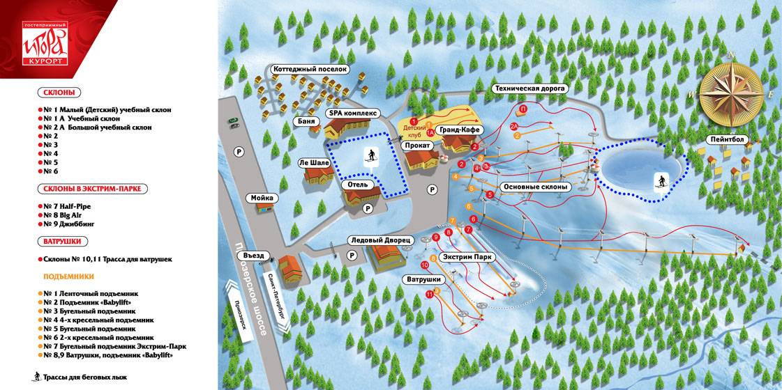 - На автомобиле. Горнолыжный курорт Игора расположен на 54 км Приозерского шоссе.