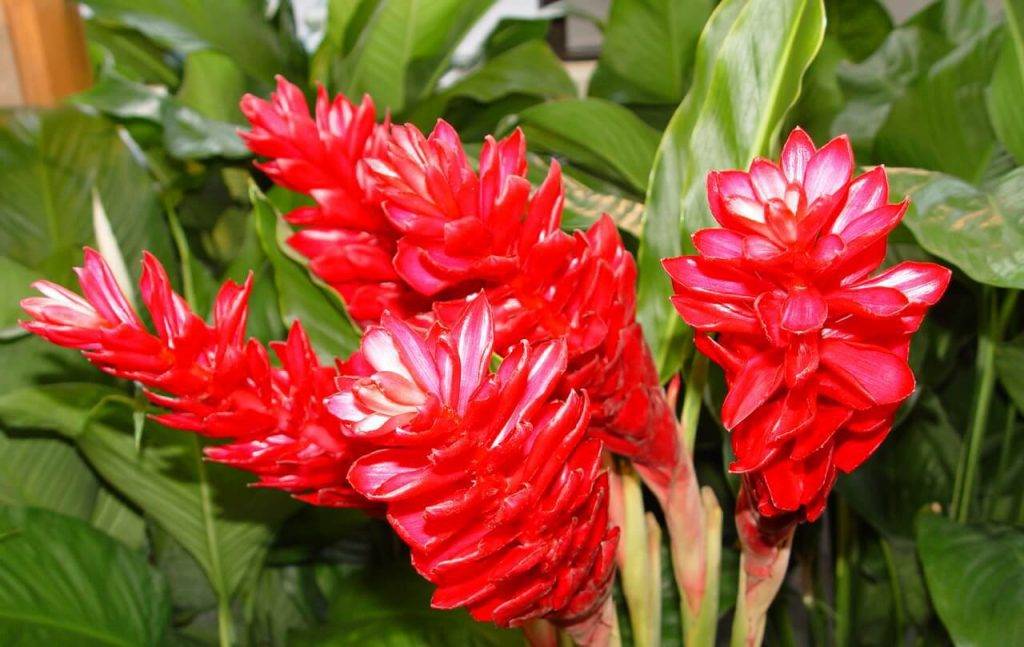 Цветки имбиря бывают разного окраса, от малинового оттенка, до светло-розового и желтого. На коротких черешках цветки собраны в продолговатые соцветия, чаще конусообразной формы. В зависимости от сорта, цветение имбиря начинается во второй декаде весны, в северных регионах – летом.