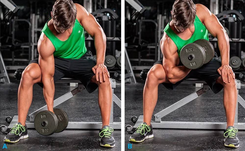 Расположитесь на тренировочной скамье, ноги слегка расставьте в стороны. Возьмите снаряд в руку, немного наклонитесь и развернитесь в сторону гантели. Локоть при этом должен упираться во внутреннюю сторону бедра.