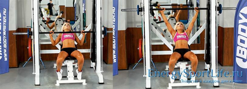 Упражнение № 3 — жим штанги на наклонной скамье в тренажере Смитта