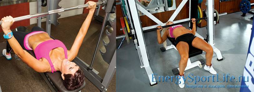Упражнение № 1 — жим штанги лежа на горизонтальной скамье в тренажере Смитта