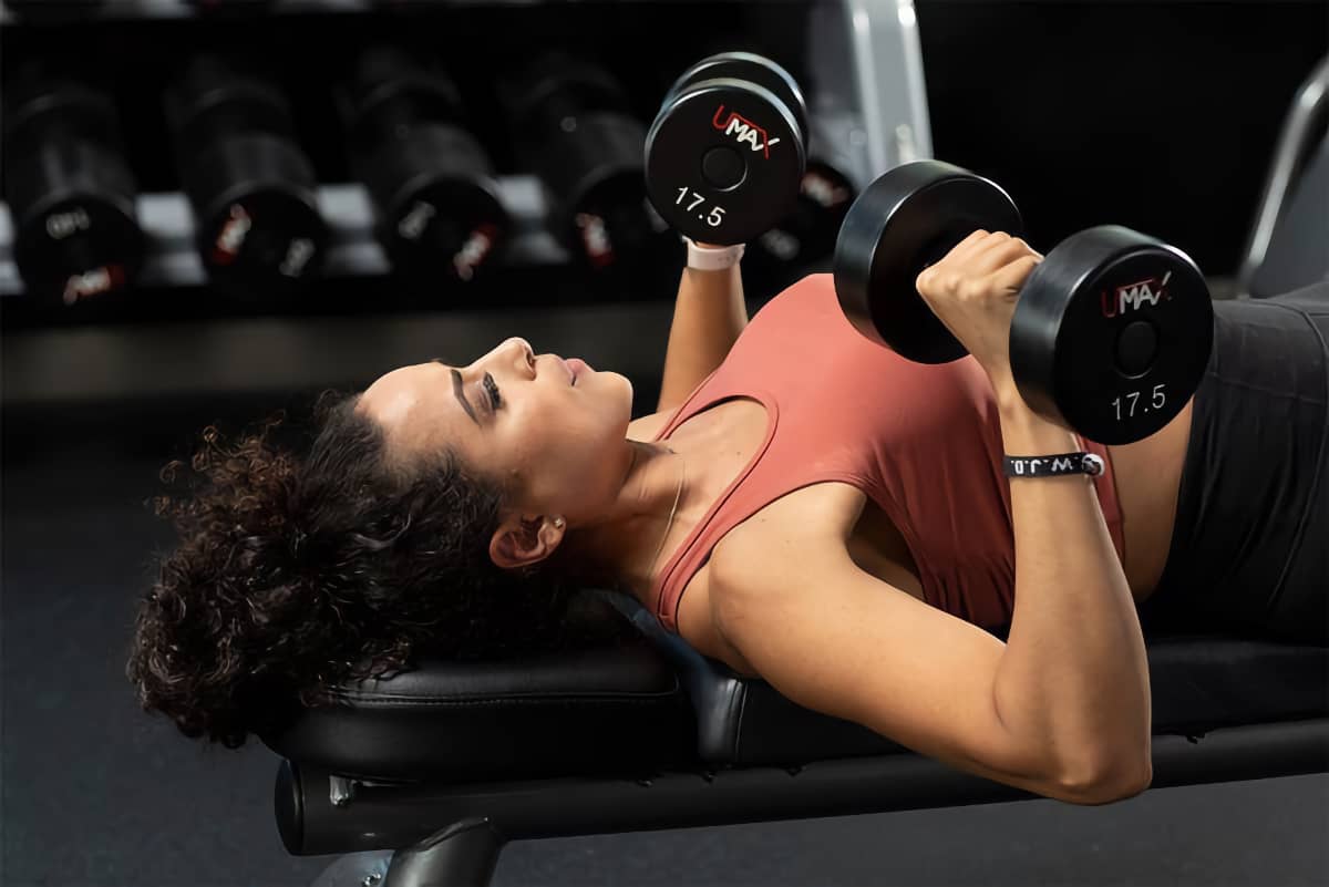 - Начать постепенно отводить гантель назад за голову. Локтевые суставы должны быть максимально распрямлены — это дает наибольшую нагрузку на грудные мышцы.