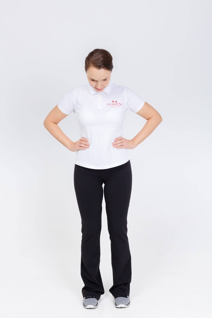 Встаньте ровно, стопы на ширине плеч, руки накрывают низ живота