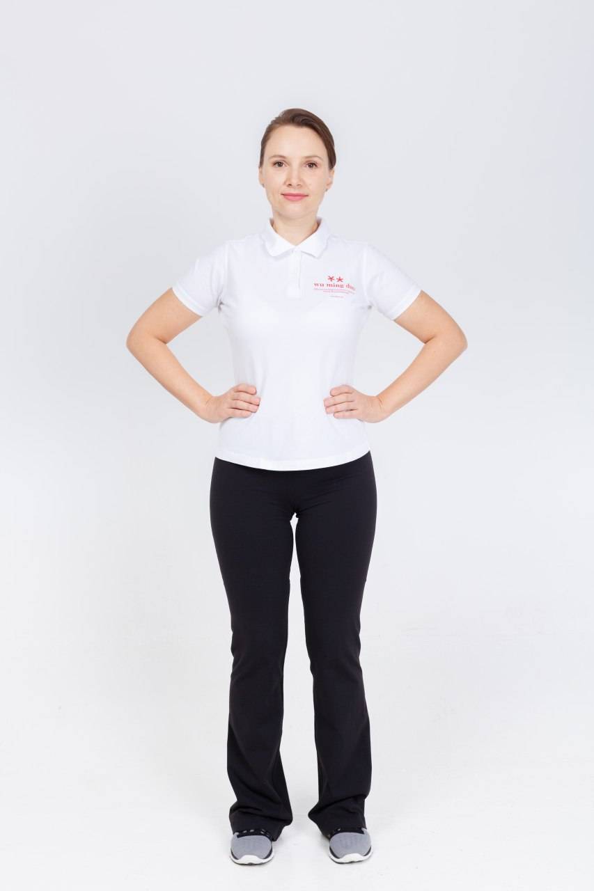 Встань прямо, ноги на ширине плеч, стопы параллельны. Колени мягкие, чуть согнуты. Ладони на талии. Макушка стремится к небу: представь, что за волосы на макушке тебя как будто кто-то нежно тянет вверх.