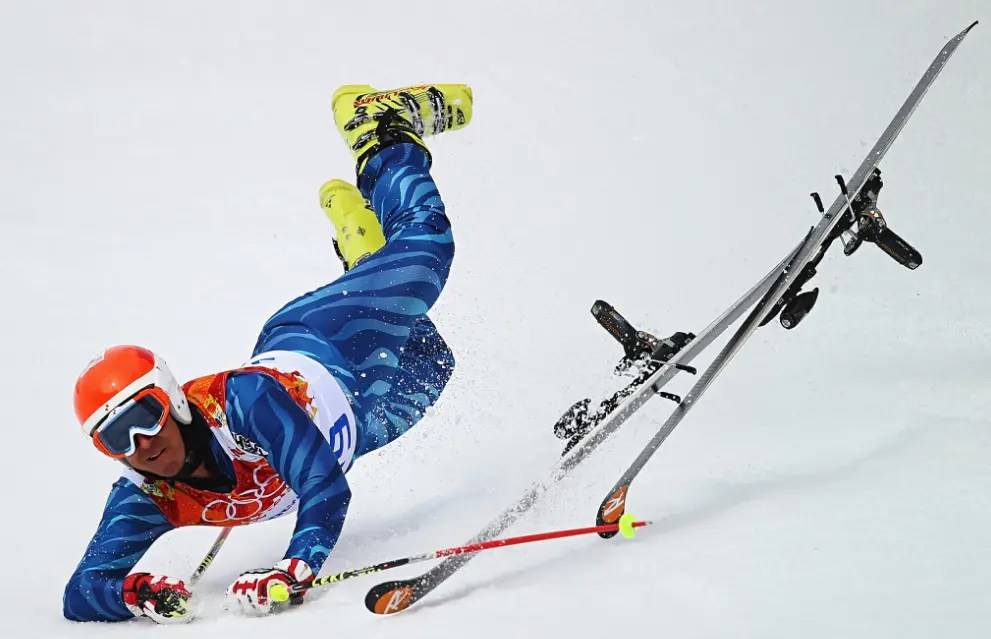 На картинке видно, что при падении задники на лыжах остались в верхнем положении, их необходимо будет опустить.