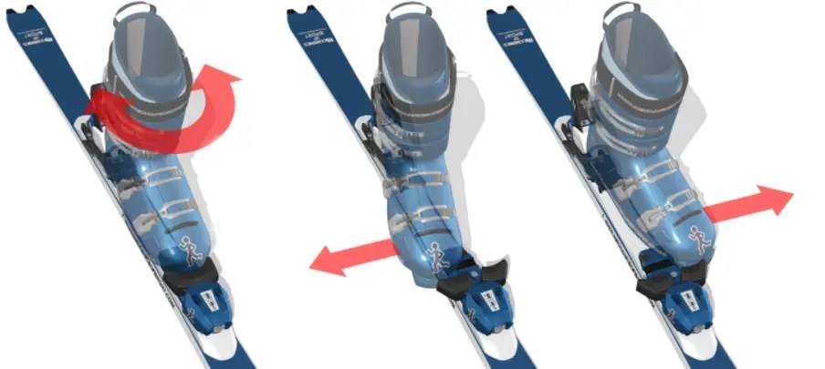 На картинке показаны три стрелки, но не хватает еще одной – вверх. Ниже, на примере креплений Tyrlia, показана работа передней головки современных креплений – она двигается не только в горизонтальной плоскости, но и вертикальной, что позволяет освобождать ноги при падении назад.