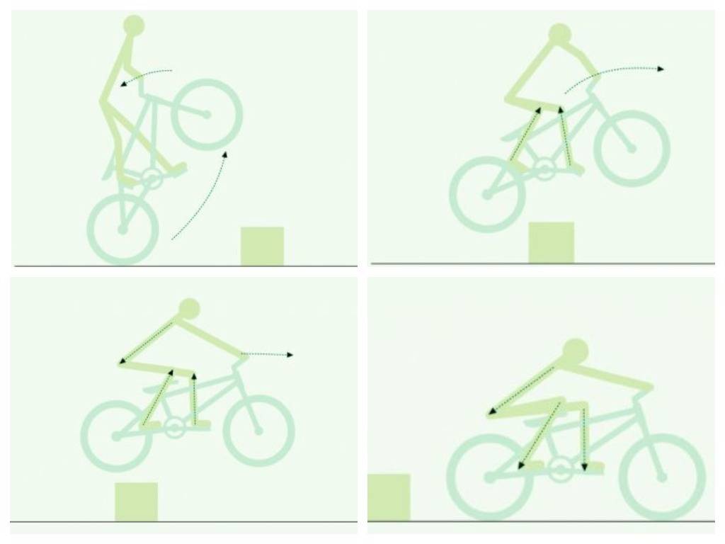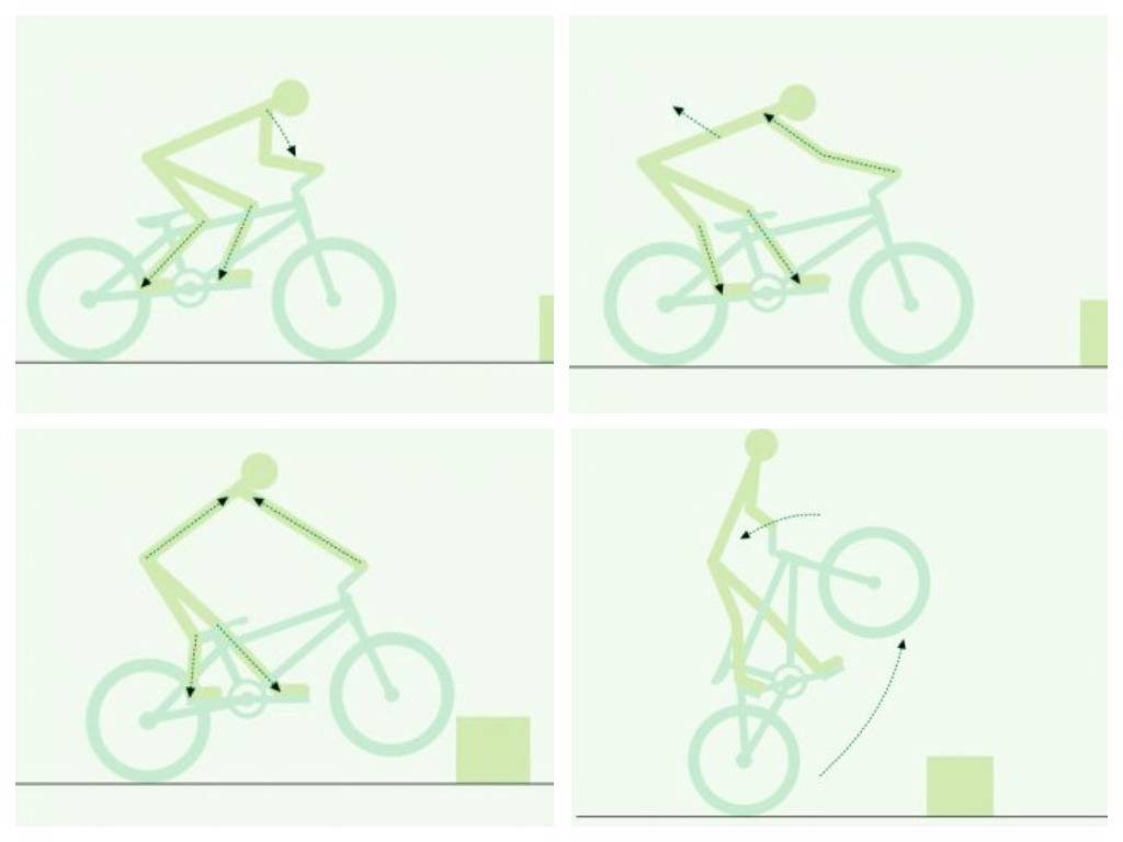 - Когда переднее колесо будет расположено высоко над землей, выпрямите ноги. Сделать это необходимо «прыгающим» движением, то есть, резко расправить, как будто совершаете обычный прыжок на месте. Помимо этого, толкайте руль вперед и вверх. Таким образом, заднее колесо тоже окажется в воздухе.