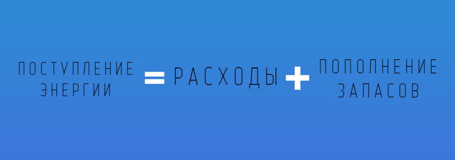 Количество энергии, поступившее с пищей, идет на покрытие расхода энергии организмом и на увеличение его энергетических запасов.