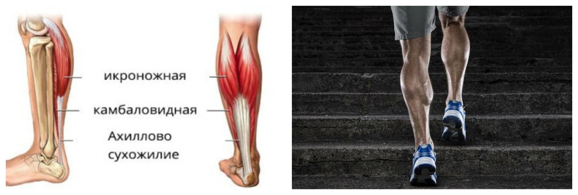 - икроножные мышцы — поднимают ступню на носок, помогают удерживать равновесие тела.