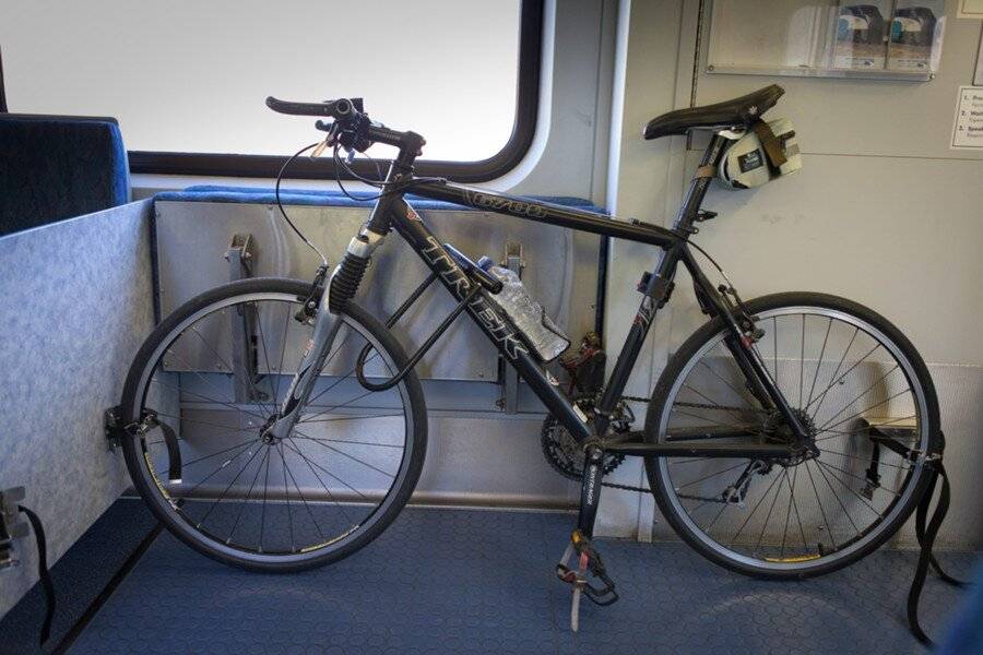Если вагон практически пустой, для перевозки велосипеда в электричке можно выбрать территорию между сиденьями. Байк там разрешается размещать как в перевернутом, так и обычном виде. В тамбуре его оставлять не стоит. Во-первых, он будет мешать попутчикам, а во-вторых его могут банально украсть. Исключение составляют только последние и первые вагоны, но лишь при условии малолюдности.