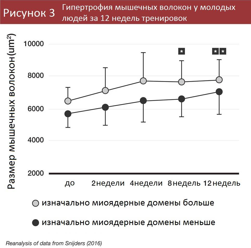 Результаты другого эксперимента с участием пожилых людей , правда, были противоположными: участники с меньшими миоядерными доменами смогли добиться значительной гипертрофии при тренировках, а участники с большими миоядерными доменами – нет.