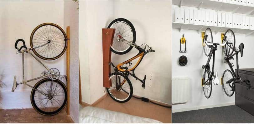 Промышленность выпускает самые разные варианты крепления велосипеда к стене за переднее колесо в вертикальном положении. Обычно они имеют возможность складываться, когда велосипеда нет на месте, чтобы не создавать опасность получить травму.
