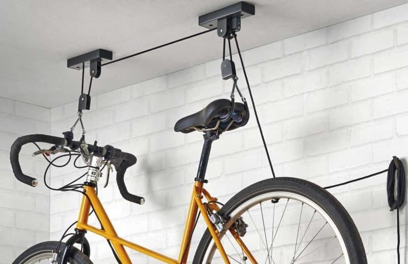 Производит впечатление устройство с применением блоков. С его помощью велик можно поднять и зафиксировать под самым потолком. Сложную систему явно лучше приобрести в магазине, так как затраты времени и сил на самоделку получатся не адекватными результату.