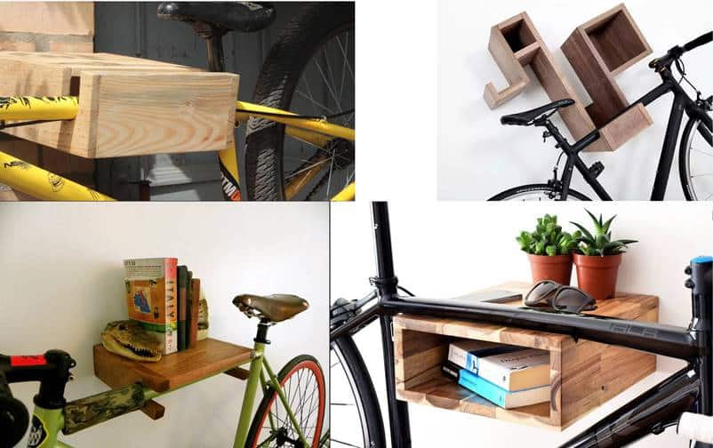 Конструкции полок для удержания велосипеда достаточно простые и для того, кто умеет работать с деревом, достаточно увидеть идею, чтобы ее реализовать. Еще четыре варианта подобных изделий представлены на следующем фото.