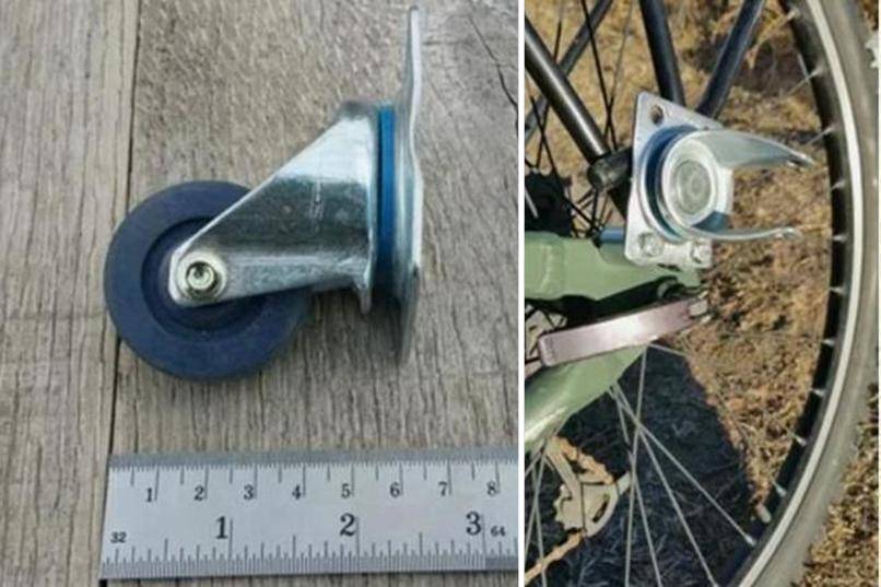 Оригинальная идея – изготовить велосипедный фаркоп из двух мебельных опор высотой 60 мм. Ролики из них удаляются, и один элемент крепится болтами с гайками к задней вилке велосипеда.